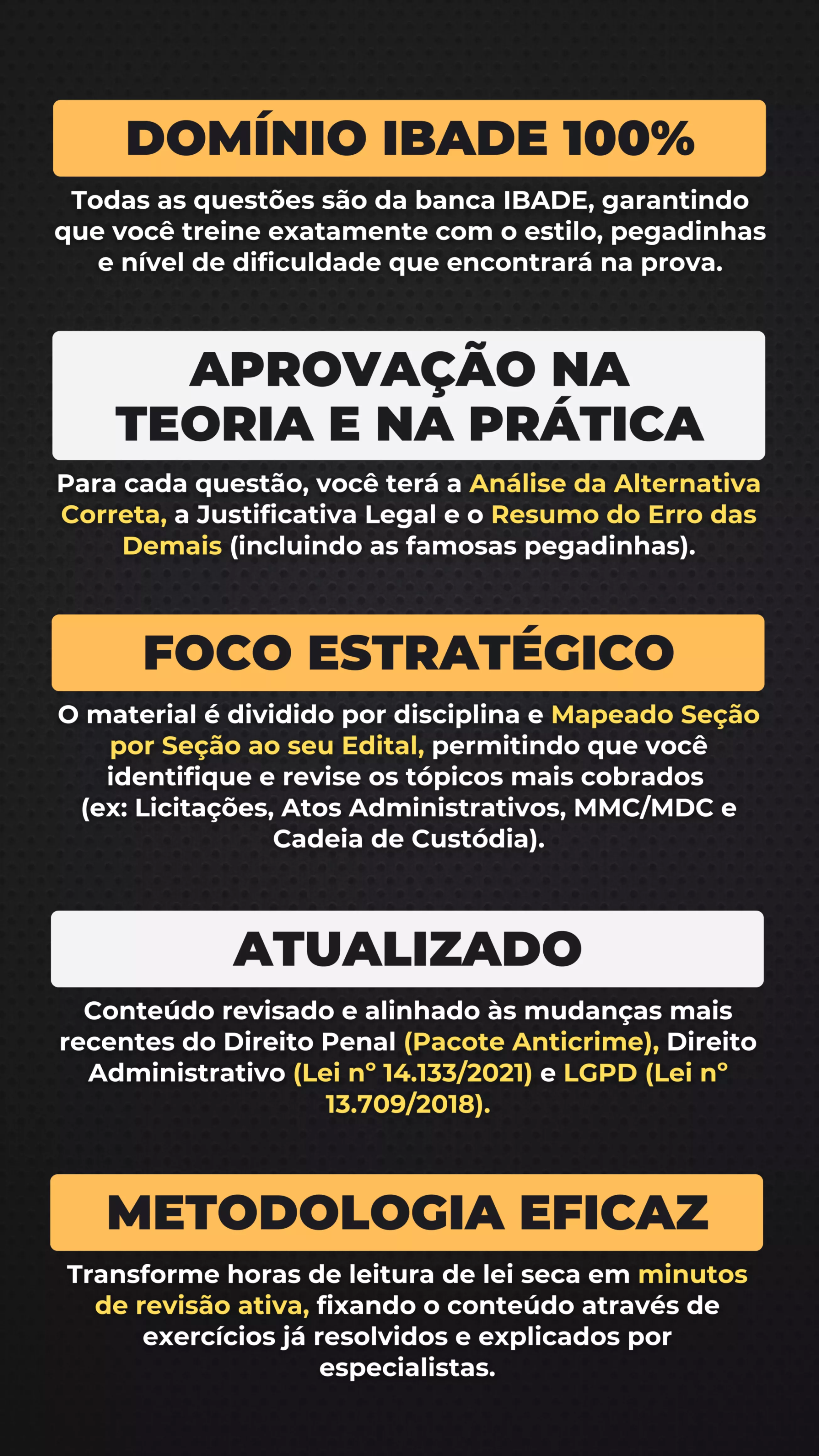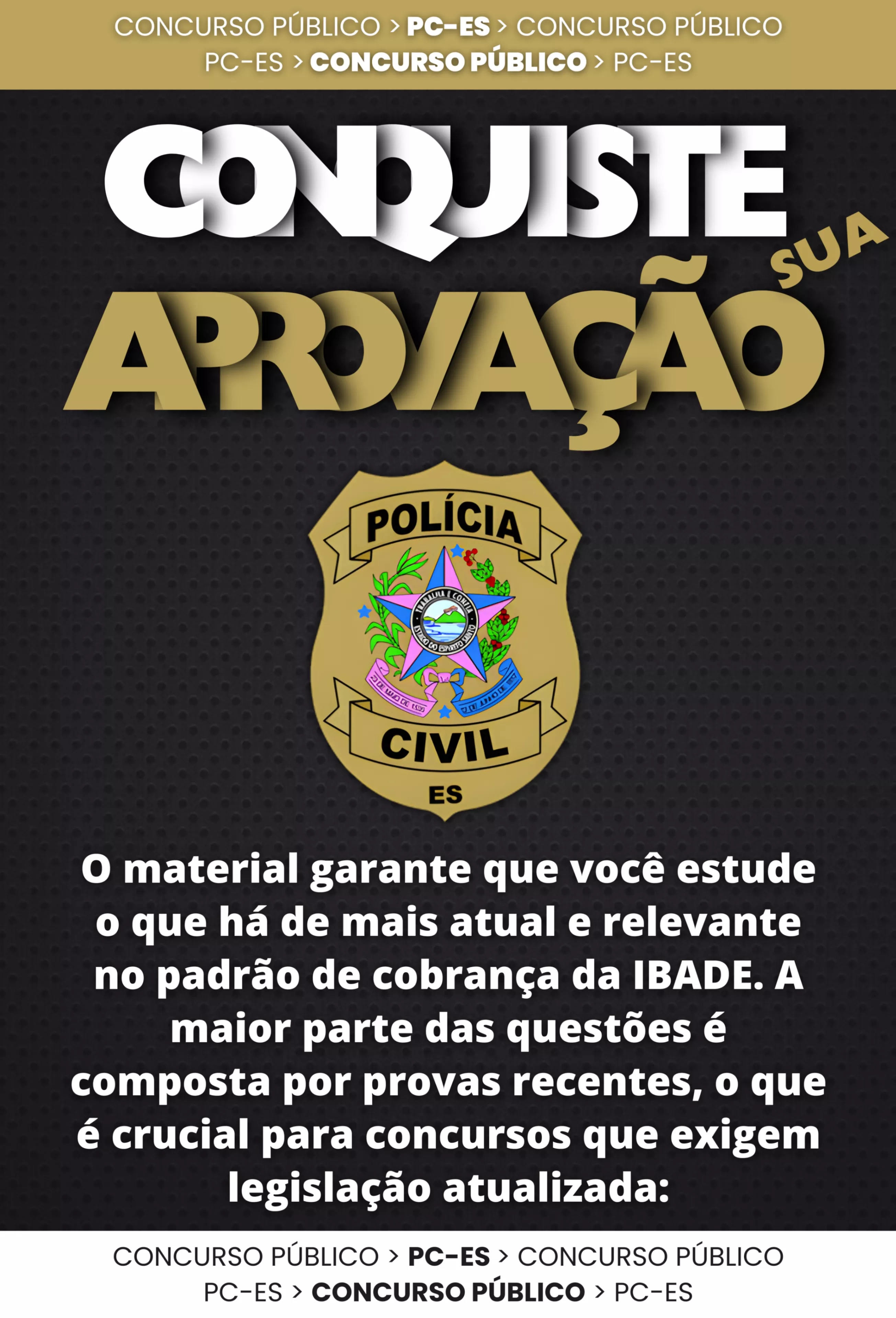Este é o material definitivo de Estudo e Revisão para a Polícia Civil do Espírito Santo. Em vez de apenas gabaritos, você terá acesso a um Combo Completo com mais de 510 Questões de Provas Anteriores do IBADE, todas dissecadas em Análises Detalhadas (Passo a Passo) e Mapeadas Diretamente ao seu Edital.